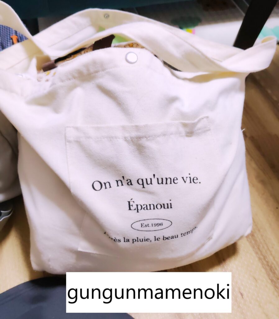 こちらが入院バッグです。(前回豆キッズの時はダイソーの大きめしましまバッグを使っていましたが、縦が長いので術後底の物が取りにくかったため、今回は横長の大きめバッグにしました。)