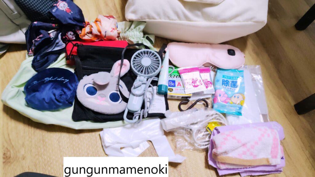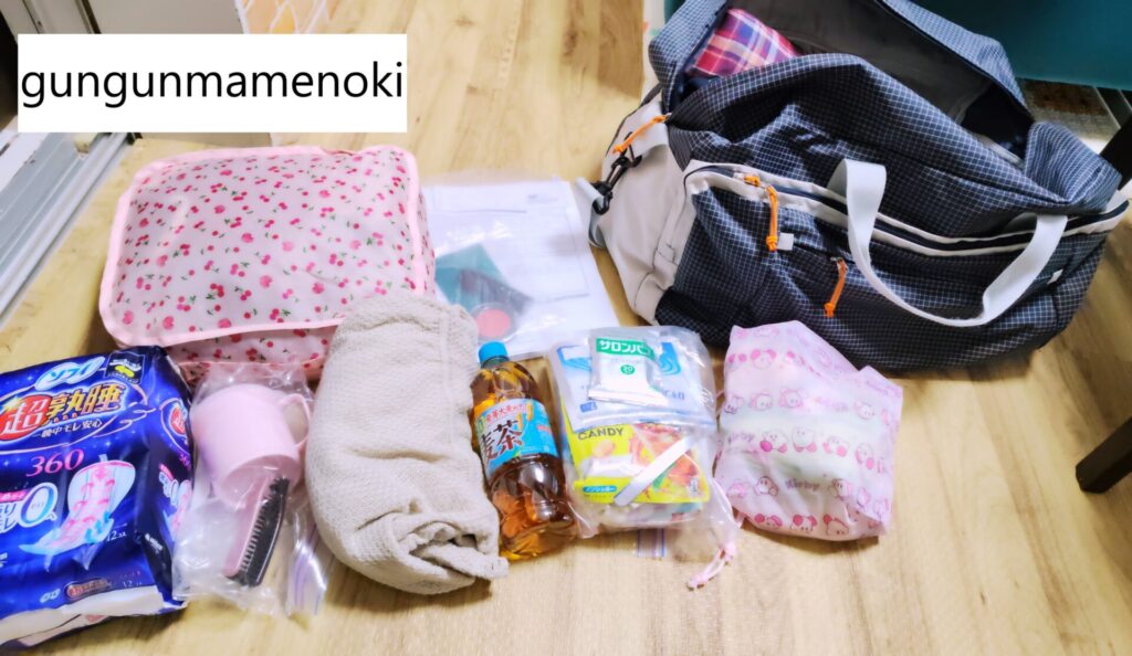 パジャマ、室内用スリッパ以外のかばんの中身(この時の写真に映っていないものもあります)