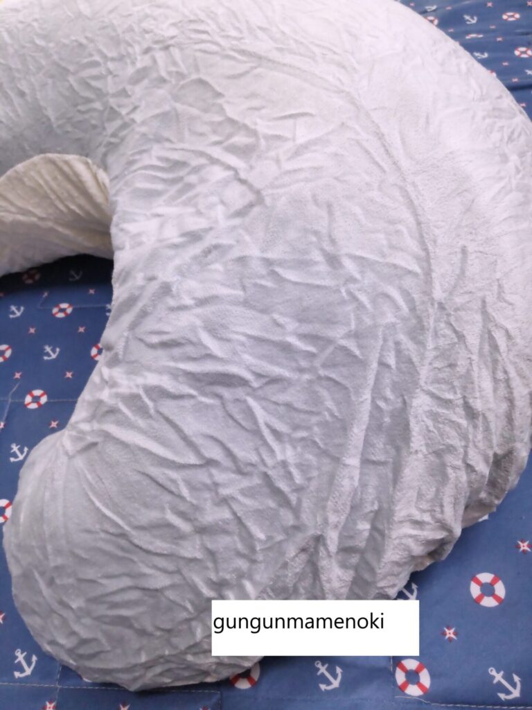 先ほどのc字型の枕を拡大したところです。中袋から取り出し、膨らんだ後は少ししわが気になるかと思いますが、徐々に気にならなくなってきます。また、初めは新品の匂いがしますが、気になる方は消臭スプレーをしたり、外干しをするなどすると気にならなくなるかと思います。※匂いづわりの方は特に注意です!